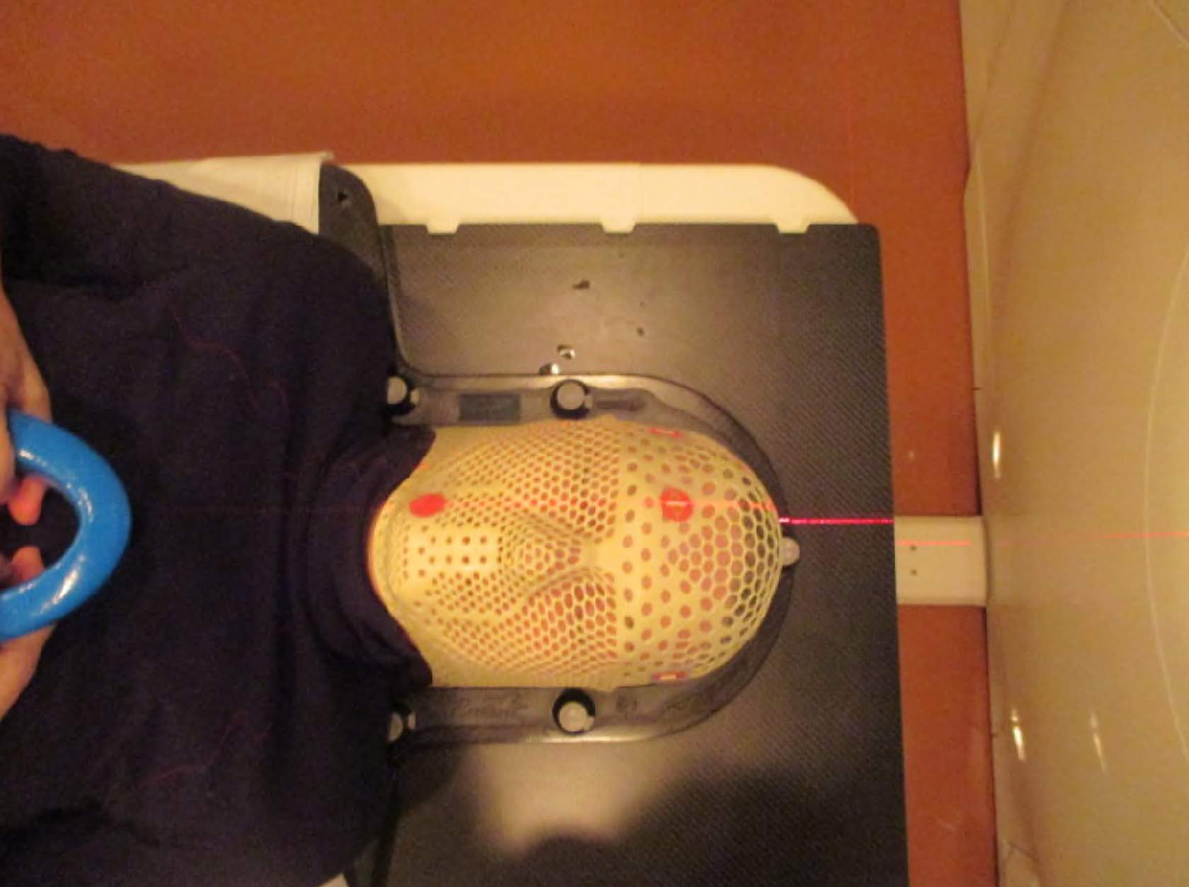 For CT simulation involving the brain, the patient is placed in the immobilization device and scanned. The isocenter or reference markers are selected and marked on the thermoplastic mask.