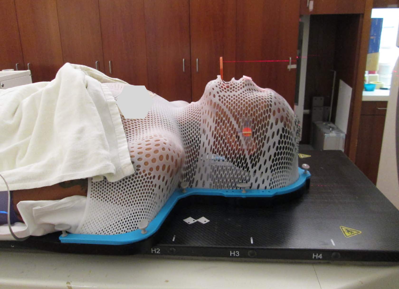 After the markings on the mask are made, therapists will take several photographs of the patient in the simulation position. These photographs and marks will serve as guides to position the patient correctly each day during treatment.