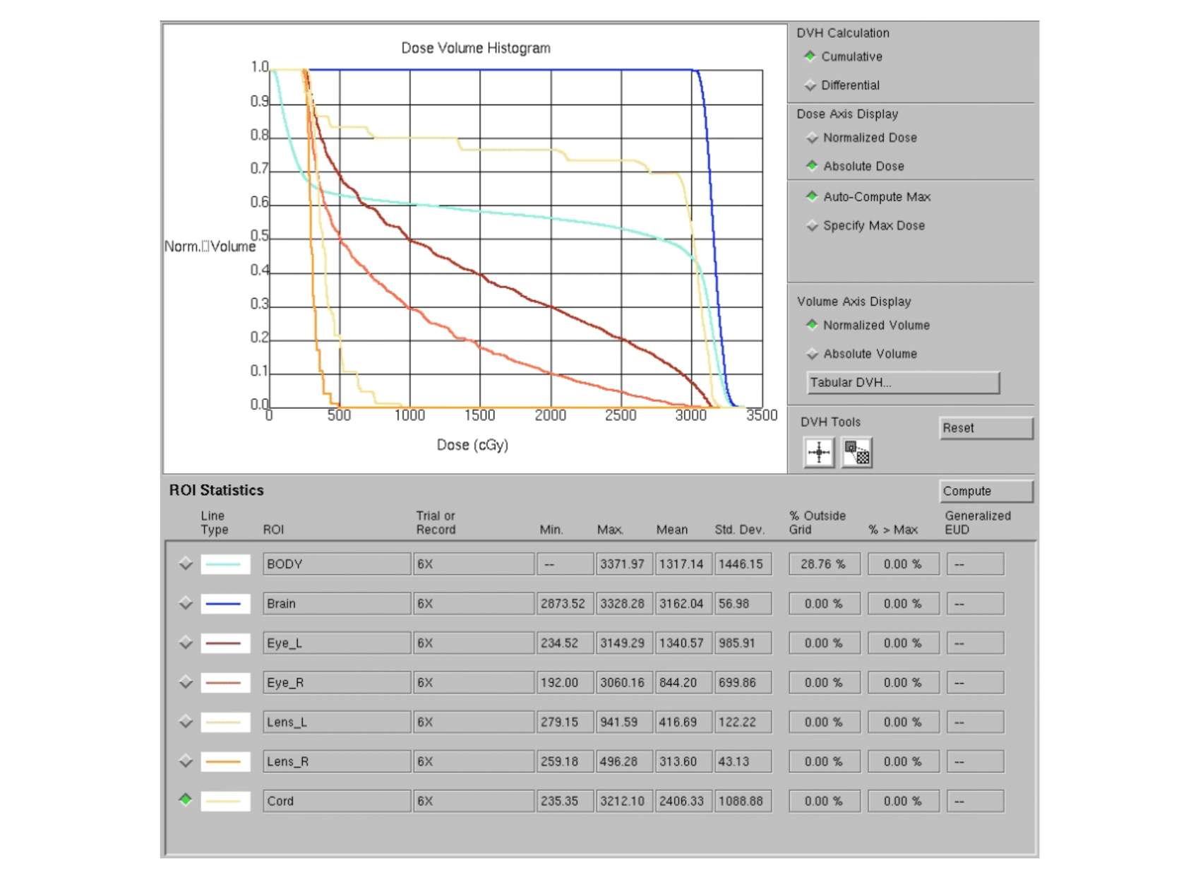 The Dose Volume Histogram (DVH) provides a quick overview of clinical goals and metrics.